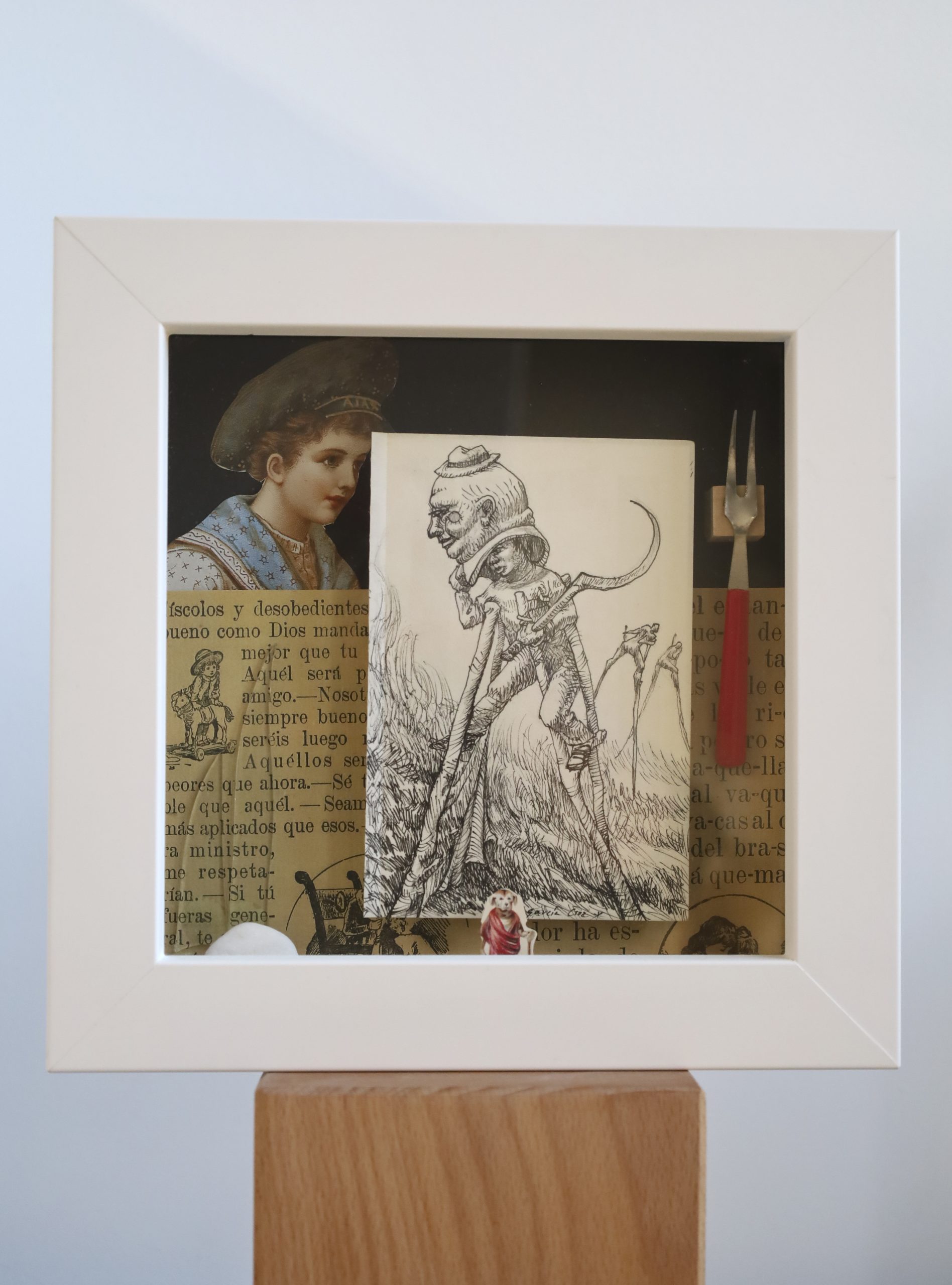 “Gigante y cabezudo” es una caja poema del artista Luis Manuel García Cruz que combina dibujo a tinta con elementos ensamblados en una composición visual cargada de simbolismo y narrativa. La obra presenta una figura híbrida y expresiva que dialoga con elementos clásicos y populares, generando un contraste entre lo tradicional y lo contemporáneo.