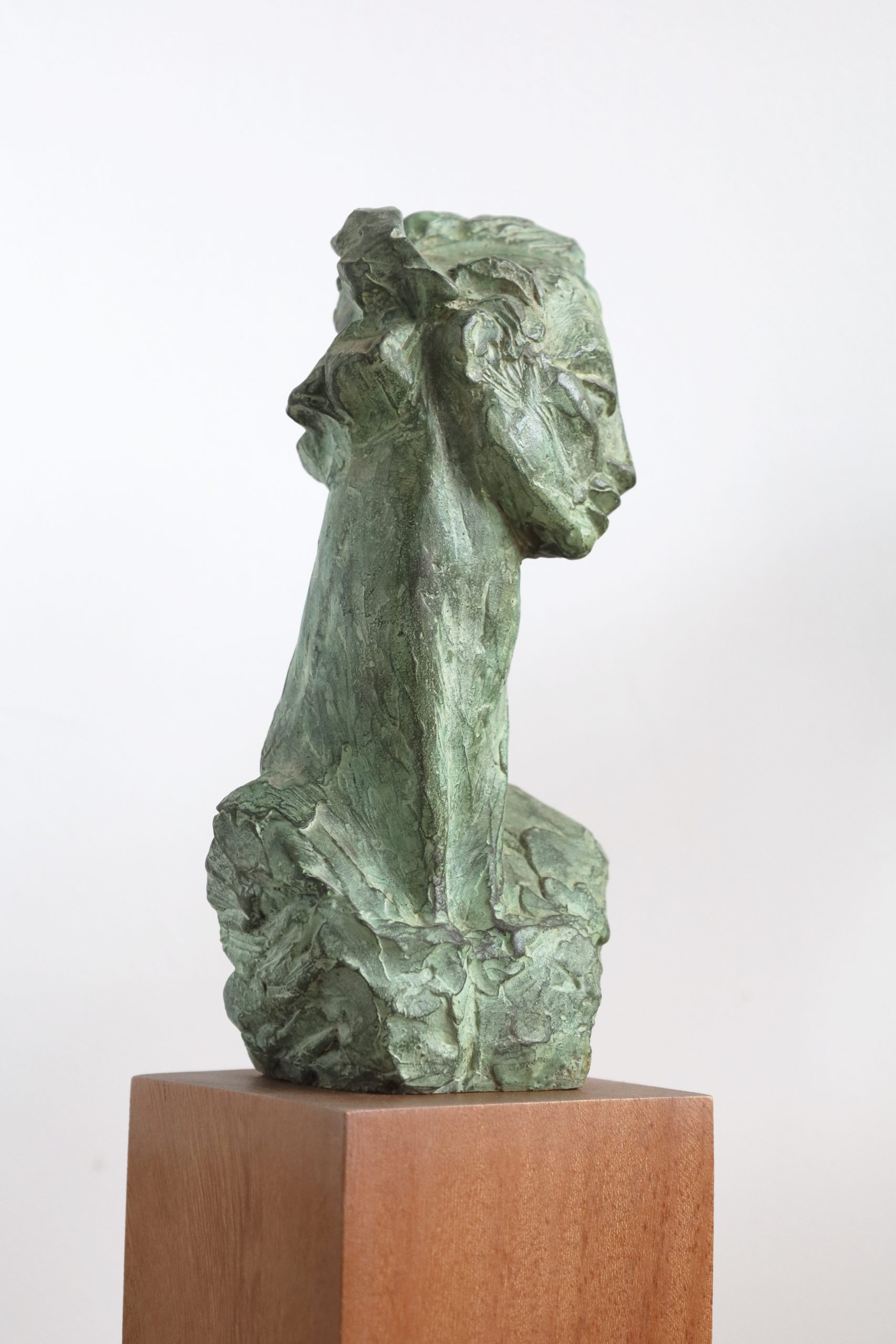 Escultura en bronce que simboliza la creación y la introspección artística.