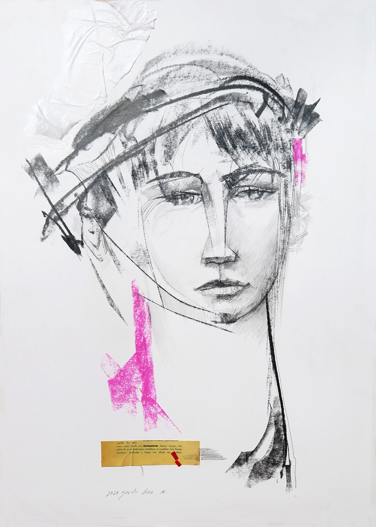 Obra contemporánea de Luis Manuel García Cruz que combina dibujo y collage en una pieza expresiva y única.